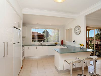 * Modern white polyurethane kitchen looking out into beautiful garden, with breakfast bar and abundant cupboard space.