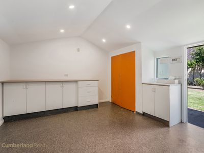 • Single garage has been converted into a teenager’s retreat or workshop, complete with bench space and new epoxy flooring