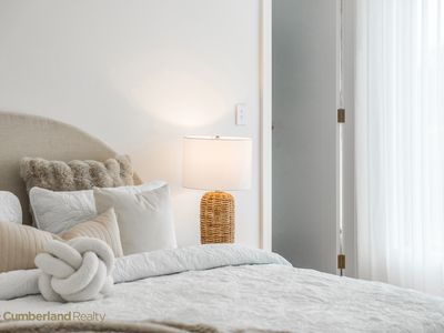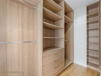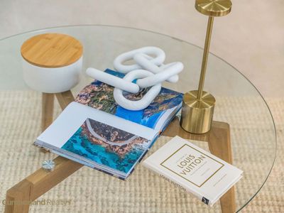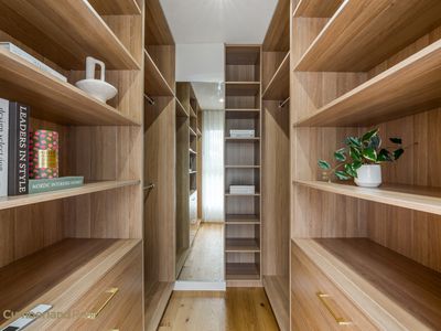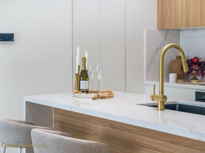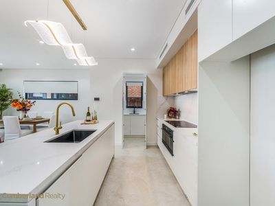 At the heart of the home sits a stunning designer kitchen that balances beauty with practicality. The oversized Caesarstone island bench invites casual dining and conversation, while statement pendant lighting creates a refined focal point. Sleek cabinetry, quality appliances & a large undermount sink with brushed gold tapware reflect the home’s attention to detail. A fully equipped butler’s pantry provides additional preparation space & storage, keeping the main kitchen effortlessly uncluttered - perfect for entertainers & busy households alike.