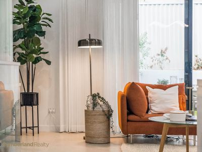 Sheer curtains soften the interiors, while carefully selected feature lighting adds warmth & elegance. The timber staircase with glass & steel balustrade acts as a sculptural centrepiece, connecting the levels with effortless style.