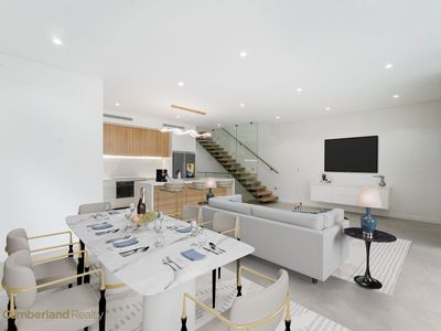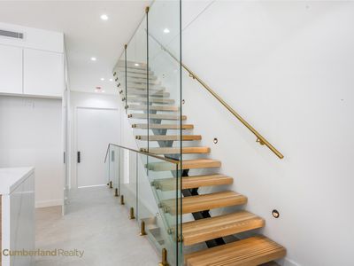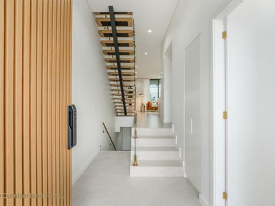 The home’s street appeal is immediate. A striking combination of textured finishes, feature stonework & warm timber accents creates a timeless yet contemporary aesthetic. The wide central staircase and landscaped frontage provide a sense of scale & arrival rarely seen in duplex living, setting the tone for what lies beyond the front door.