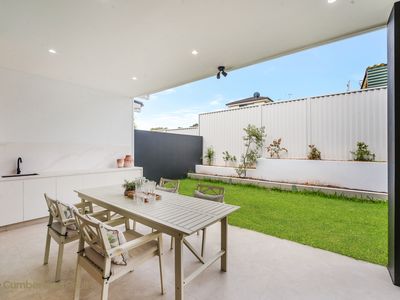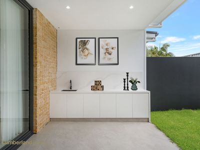 Glass sliding doors extend the living space to a covered, tiled alfresco area, creating a seamless transition for entertaining year-round. The outdoor kitchen features a Caesarstone bench with integrated sink and generous storage, making outdoor dining effortless.