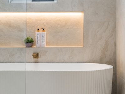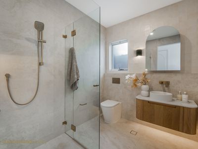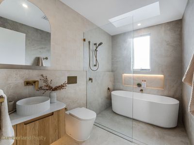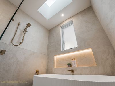 • Designer main bathroom with freestanding bath and open shower